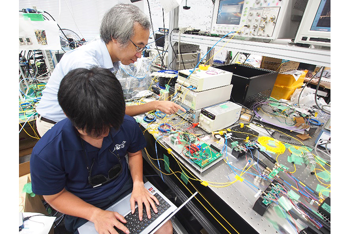 「既存の光ファイバーに使われている光変調器と同様のコンパクトなサイズで、光コムを可能にする変調器型光コム装置の製作に取り組んでいます。これを光ファイバーの入り口と出口に使うことで、インターネットを100倍速くするようなことをめざしています」と坂本先生は話す。