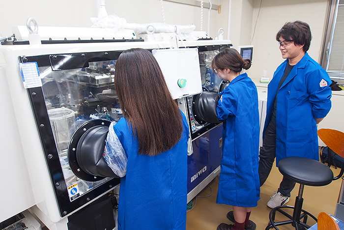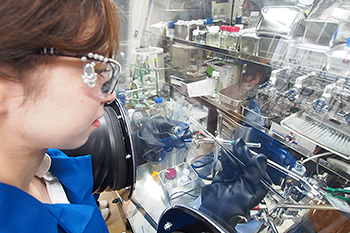 不活性ガスで満たされたグローブボックスのなかで物質の合成実験を行う