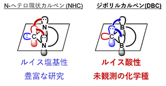 従来多く用いられてきたカルベン(左)は強く電子を与える性質を持っていたが、ホウ素を二つ結合させることで、カルベン炭素が強く電子を受け入れる性質を持つことを示した(右)。炭素中心の電子配置が逆転していることが特異な性質のカギである。