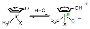 イリジウム金属とシクロペンタジエノン配位子の組み合わせによって、炭素―水素結合を炭素マイナスと水素プラスに切断した。イリジウム中心から有機配位子への電子移動によって、新たな結合切断が可能になった。